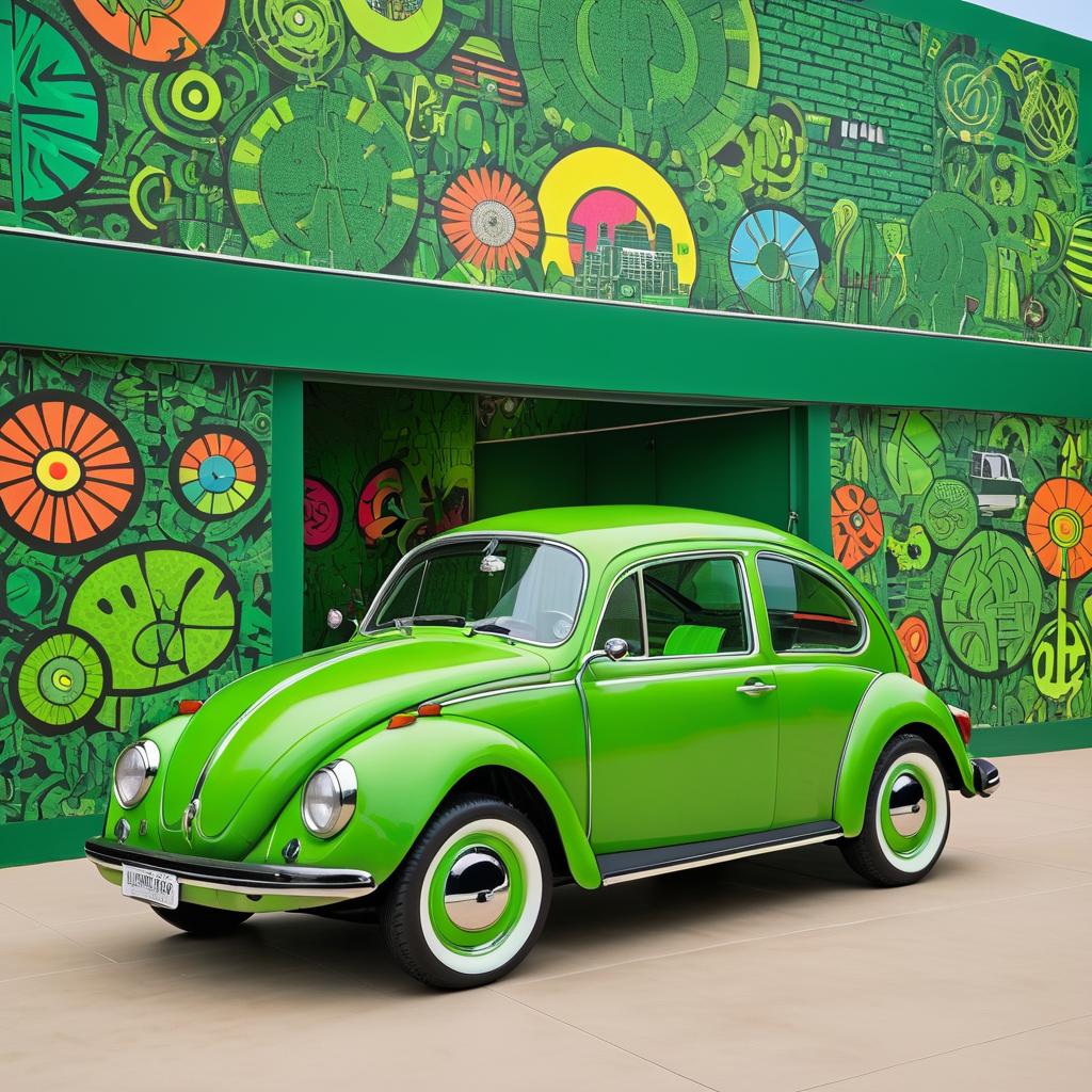 A vintage green Volkswagen Beetle, no people, styled by Keith Haring, with vibrant colors and comic cover art influences.