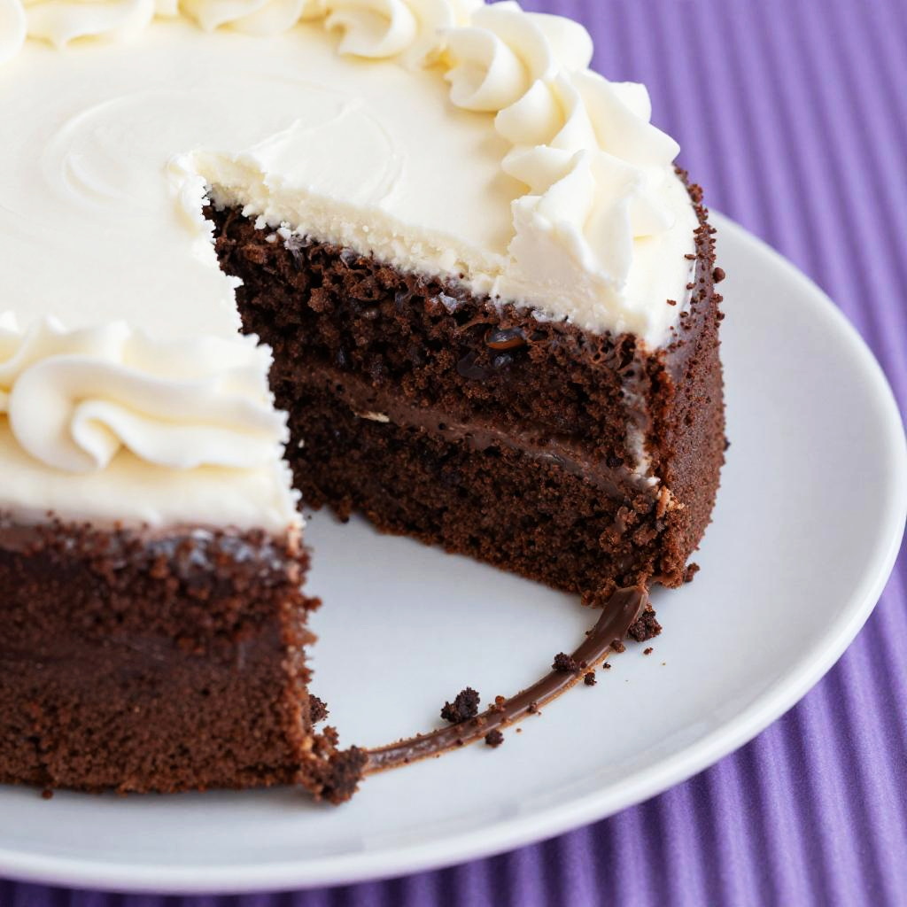 This is a close-up photo of a partially eaten chocolate cake on a white plate. The cake has a rich, dark brown, crumbly texture with a thick layer of white frosting on top. The frosting is slightly uneven, with some areas showing the cake underneath. The plate is placed on a purple, ribbed surface that adds a subtle background texture. The image has a high-contrast, almost surreal quality.
