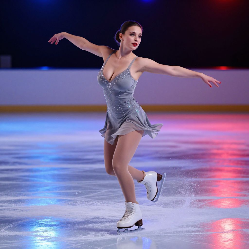 A dynamic action shot of a woman with sharp cheekbones and hazel eyes in a grey ice skating dress as a costume, mid-skate turn on a smooth, artificial ice rink with neon blue and red lighting, ice splashing around her, the dress clinging to her figure in motion, the fabric reflecting the lights and showing texture and movement in the cold, reflective environment.. The woman has big tits and cute face