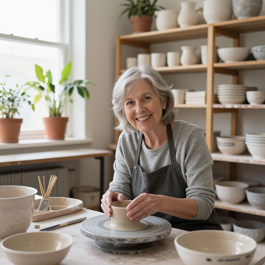 Senior woman with grey hair smiles warmly while working in her pottery studio, surrounded by shelves filled with various clay pots and bowls, with natural light streaming through a window adorned with potted plants.