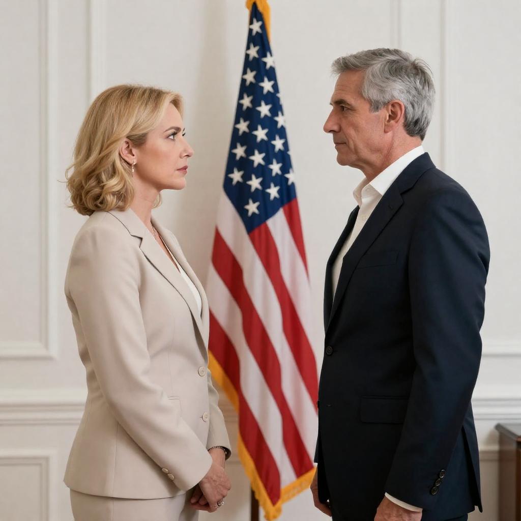 Photograph of a man and woman walking side by side in an aircraft hangar. The man, with short dark hair, wears a gray blazer, white shirt, and blue jeans, holding a white folder and a pen. The woman, with blonde hair, wears a red knee-length coat dress and beige heels, carrying a white folder. Background includes a red and white aircraft, green cargo nets, and industrial equipment.