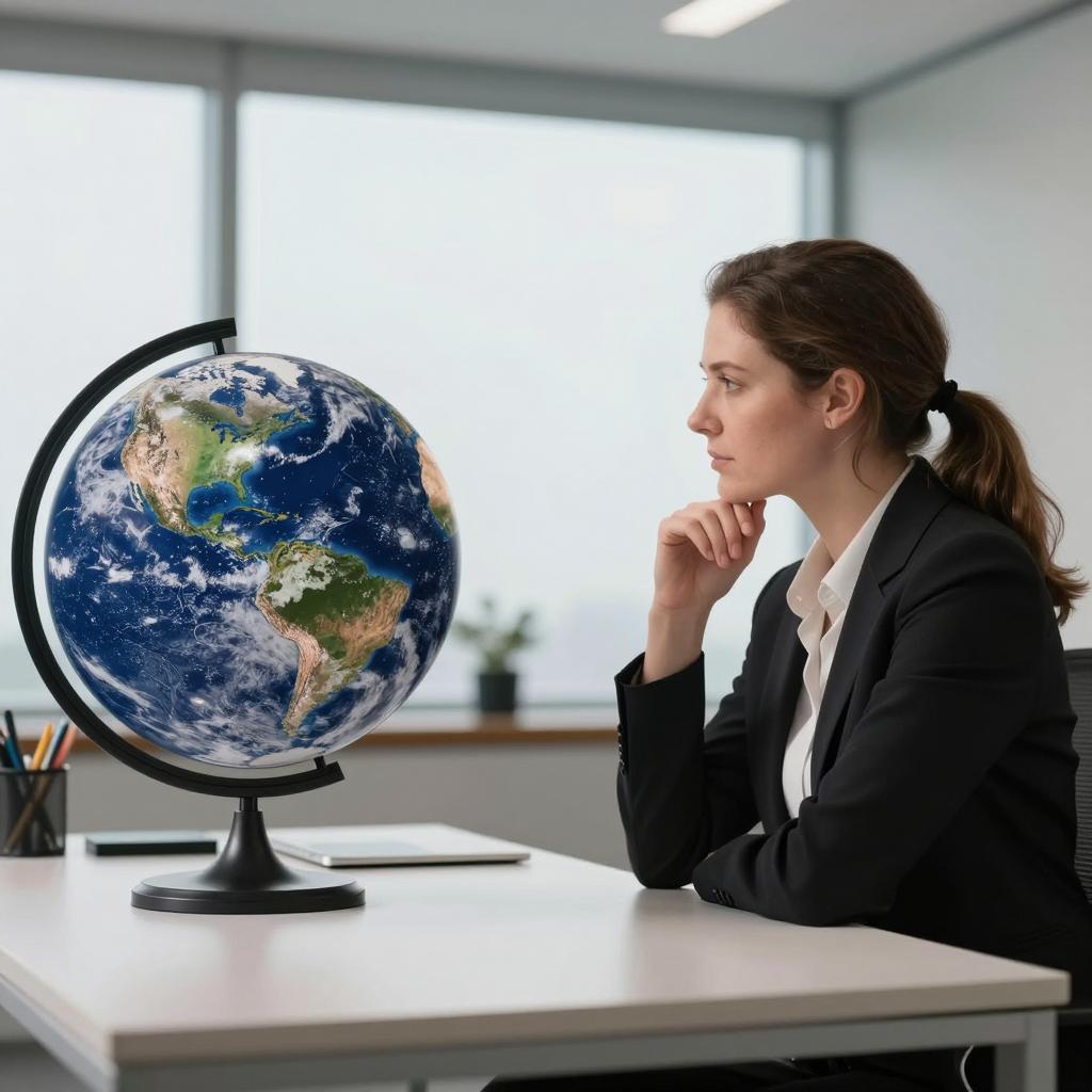 Blonde woman with light skin and blue plaid shirt holds a polished silver sphere in her right hand. She has light blue eyes, slight smile, and long hair. Man in dark blue cap and plaid shirt is partially visible on the right, focused on her. Office setting with desks, chairs, and red storage bins in the background. Woman wears a large silver ring on her right hand.