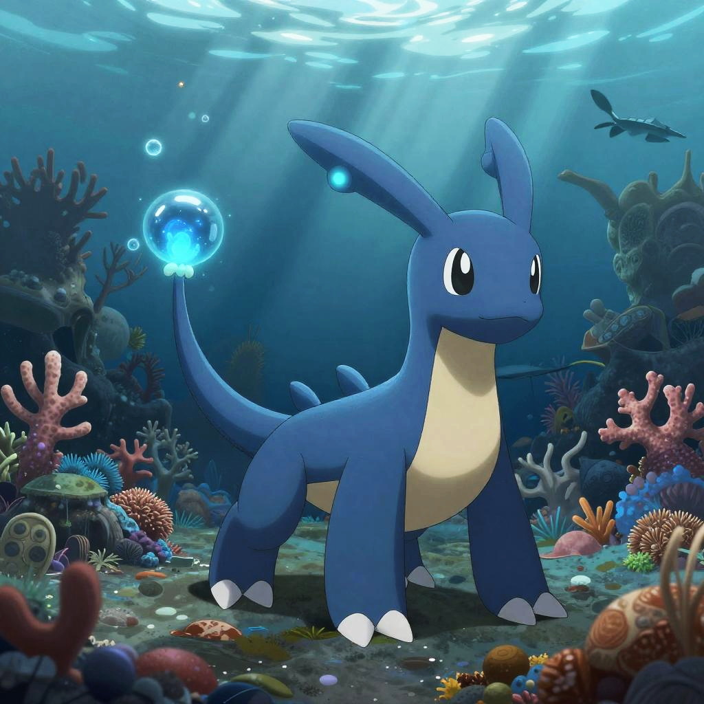 Photograph of a vibrant, yellow, Pikachu-shaped sea creature with black-tipped ears, round red cheeks, and black dots along its back, resembling Pikachu's design. The creature has a sleek, slightly textured body and a finned tail. It is set against a colorful coral reef background with various corals, sea anemones, and small fish in shades of blue, pink, and orange. The background is slightly blurred, highlighting the creature as the focal point. The overall scene is underwater, with a bright, blue, oceanic light illuminating the scene.