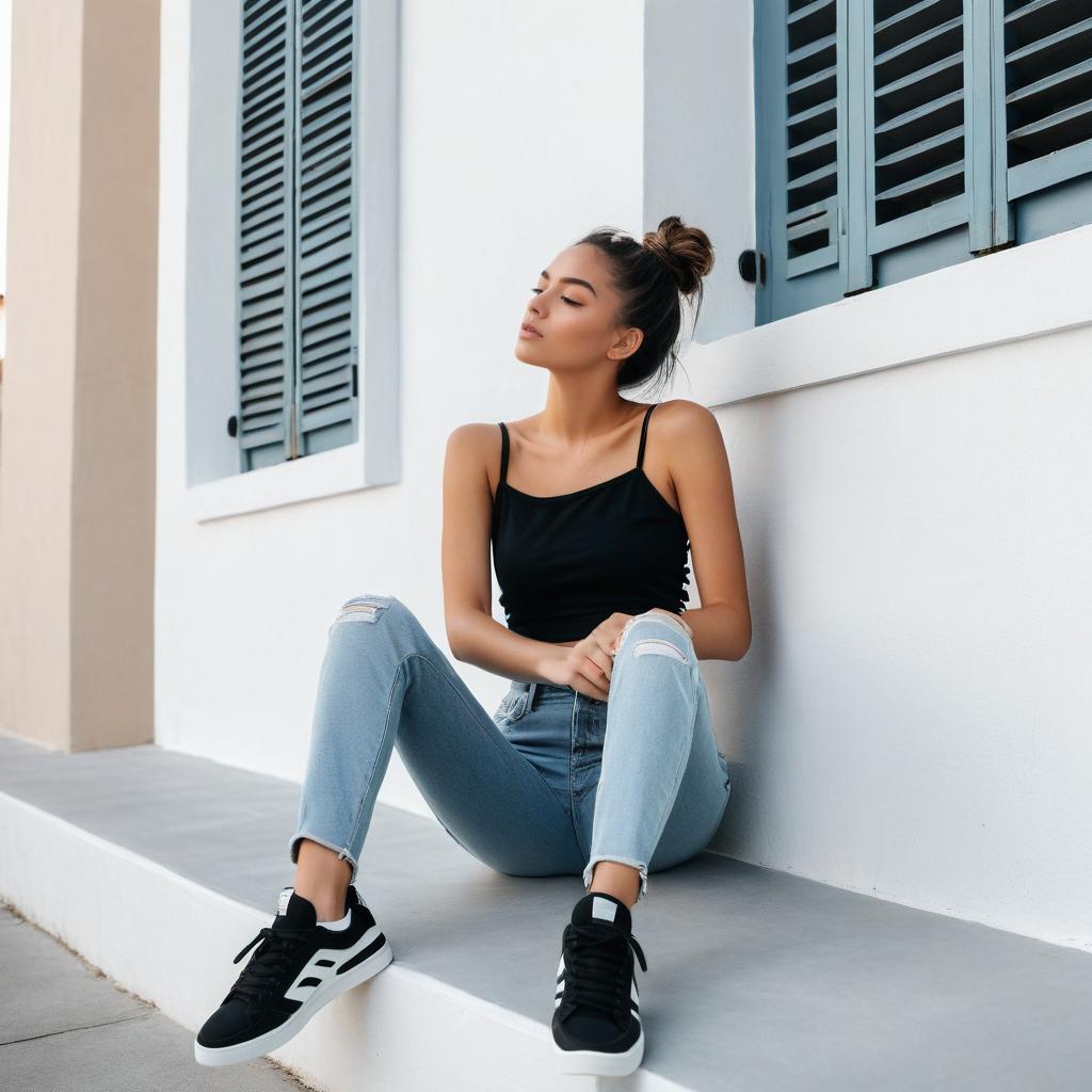 A young woman sitting on a white ledge beside a minimalistic urban building with neutral colored walls and windows with shutters. She is wearing a black spaghetti strap top, light blue rolled-up jeans, and black high-top sneakers with white laces. The setting is outdoors with natural sunlight casting soft shadows. The style is casual contemporary with realistic skin tones and an overall muted color palette featuring blue and black tones.