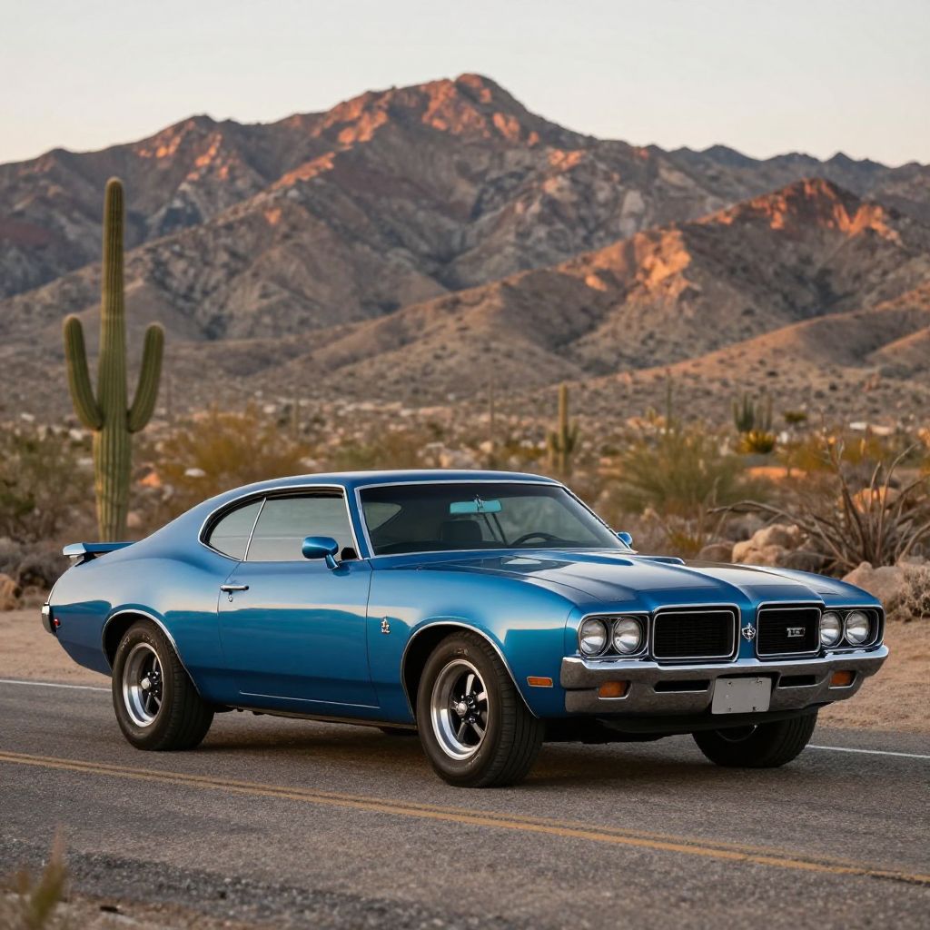 A vintage blue muscle car, likely a 1970s Oldsmobile Cutlass, parked on a desert road with a rugged mountain range in the background. The scene features desert vegetation including cacti and shrubs under soft, warm lighting during sunset or sunrise.
