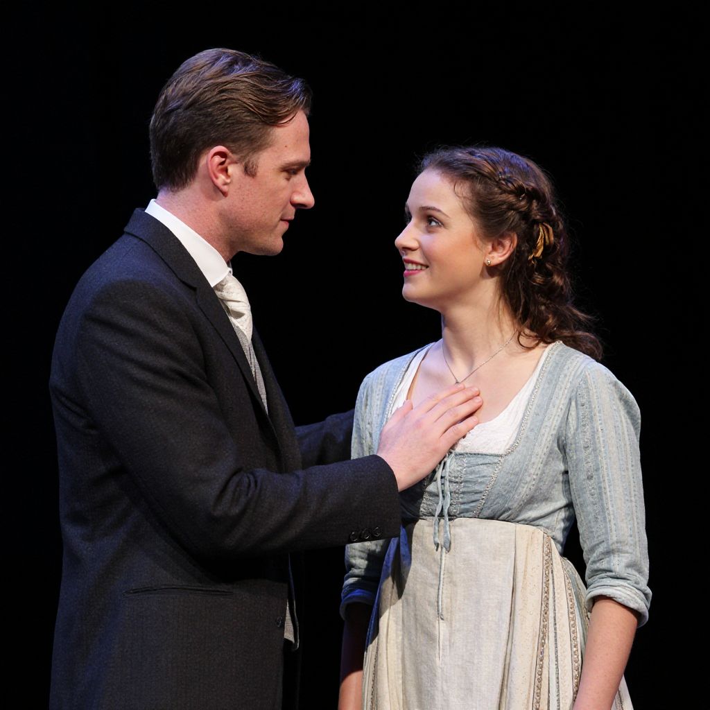 Actors perform an intimate scene in a theater production of *Dames at Sea*, with a man in a dark suit gently placing his hand on a woman's chest as she smiles warmly, both dressed in period costumes against a stark black backdrop.