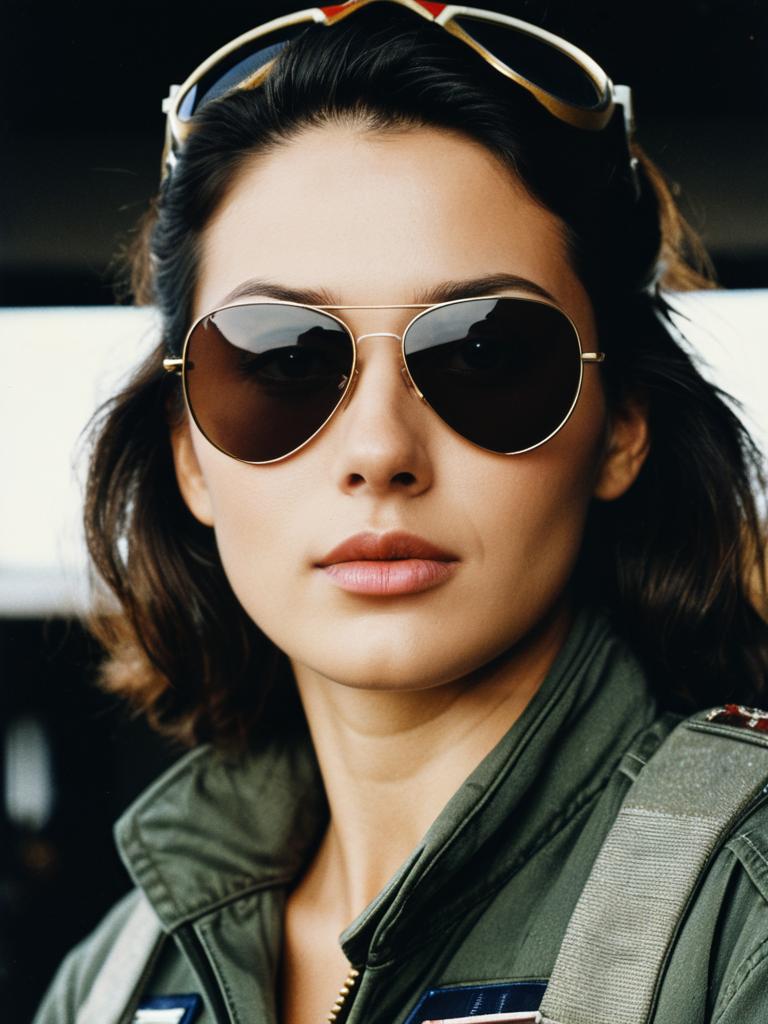 Woman in Top Gun costume, close-up headshot with aviator sunglasses