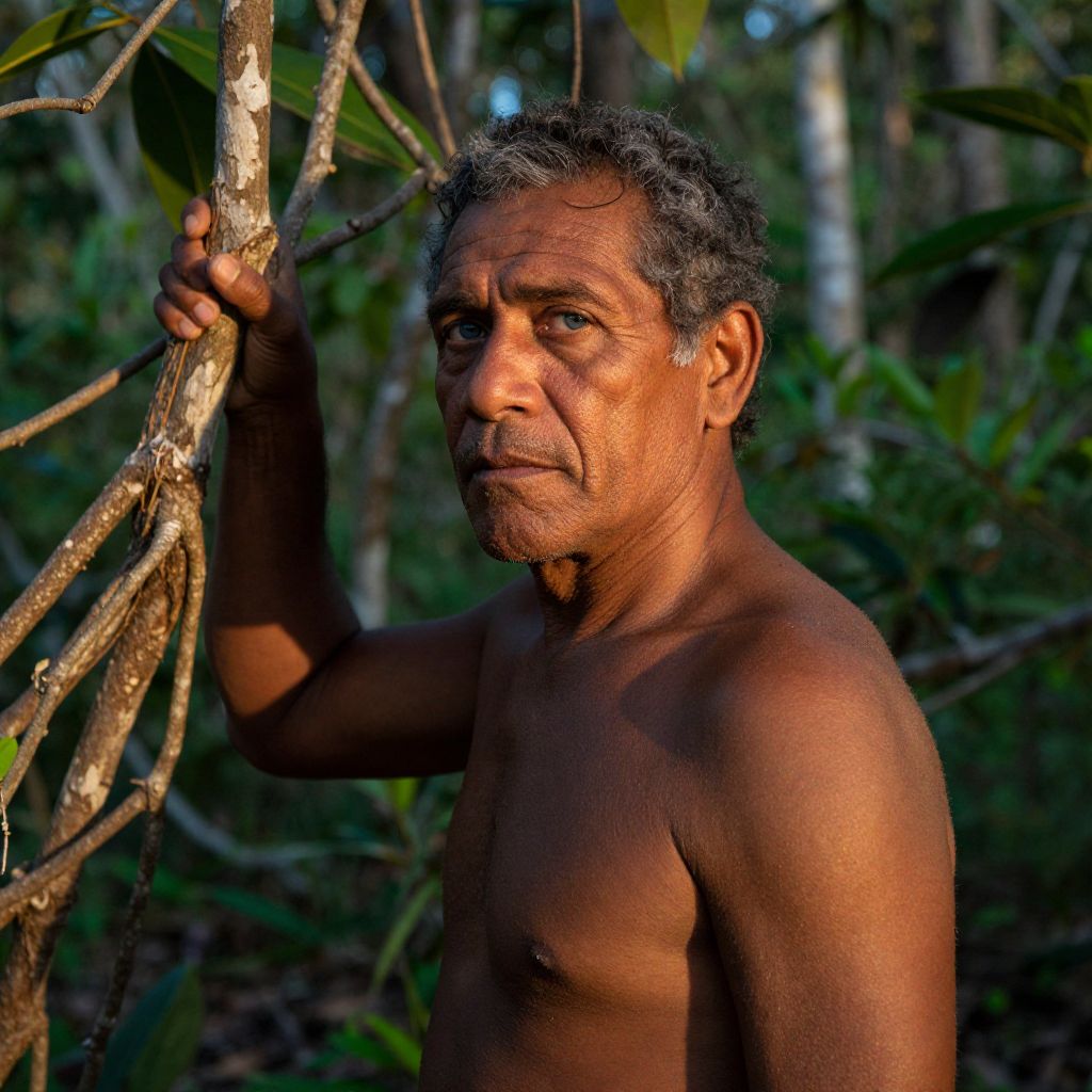 Photograph of a shirtless, middle-aged, dark-skinned man with curly gray hair, standing in a forest, holding a tree branch, sunlight