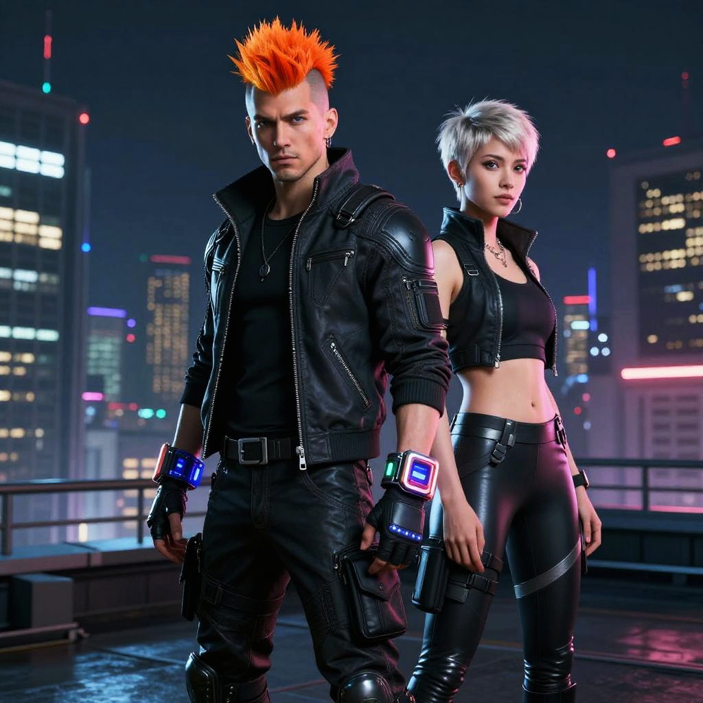 A cyberpunk scene featuring a charismatic male hacker with neon orange mohawk and flashing wristgear next to a nimble female parkour runner with platinum pixie cut, set in a glowing truss-lit urban rooftop at night, wearing smart-textile reinforced jacket and reflective flight leggings, hyper-realistic, ray tracing, dynamic lighting, high detail