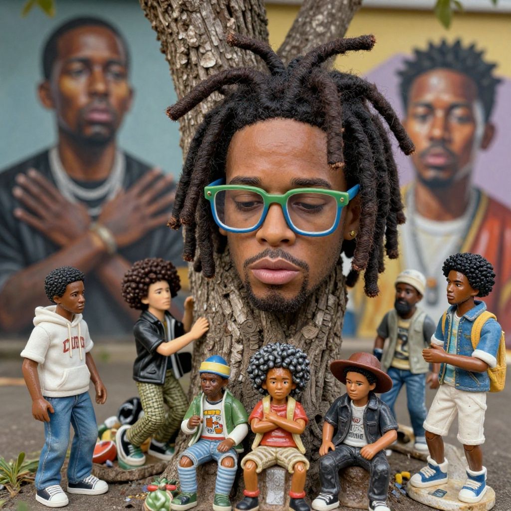 Photograph of an African-American man with dark brown skin, large green-framed glasses, and prominent black dreadlocks, centered against a tree trunk. He has a short beard and closed eyes. Surrounding him are small, detailed African figurines in various outfits, including a white hoodie, green jacket, and straw hat. In the background, there are two large, blurry portraits of the man in a blue wall. The figurines are arranged in a semi-circle at the base of the tree, with one figure standing to the left and one to the right. The image combines realistic photography with miniature figurative art.