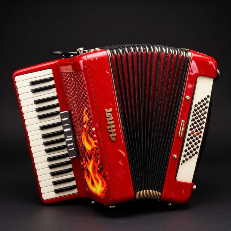 Kawaii Expressions Ultra 8k high quality. A red color Hohner Accordion with fire flames colorful coming out of the body. Dark background,
