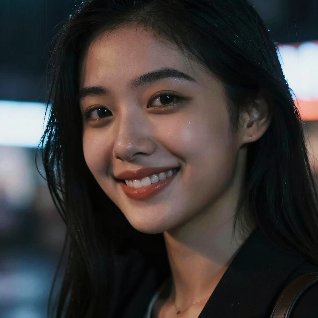 Seductive smile on a mysterious woman under dim neon lights, close-up portrait with soft shadows, glossy lips slightly parted, intense gaze, urban night background with rain droplets, cinematic mood, high detail, 4k clarity