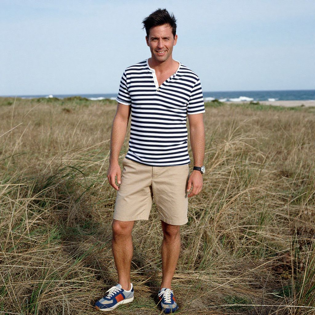 A man, striped navy and white henley shirt, khaki shorts, retro-inspired tennis shoes, coastal wind-swept field, 3M ferrania analog film stock, relaxed smile, vibrant energy. Man has masculine face and piercing eyes