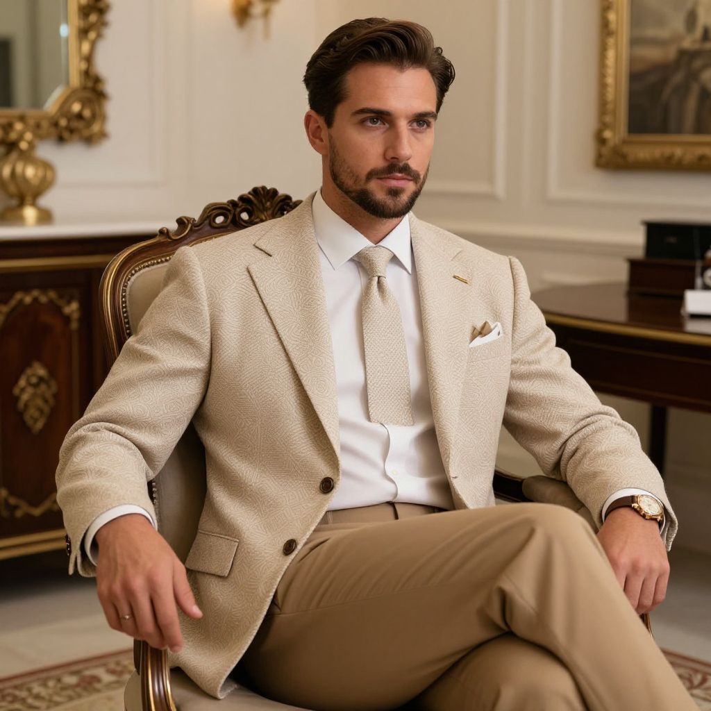Man wearing a beige suit with a patterned jacket and tan pants, stylish and sophisticated, confident demeanor, professional appearance, well-dressed for a business setting, sharp tailoring, classic grooming, calm and composed expression, sitting in a formal chair, surrounded by a luxurious office environment with elegant decor and soft lighting, high-quality photography, detailed textures and realistic rendering