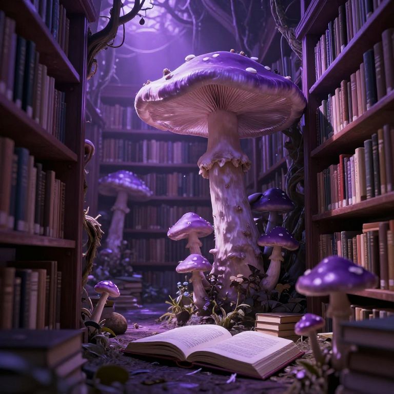 Sentient Mushroom Library Under Violet Sunlight