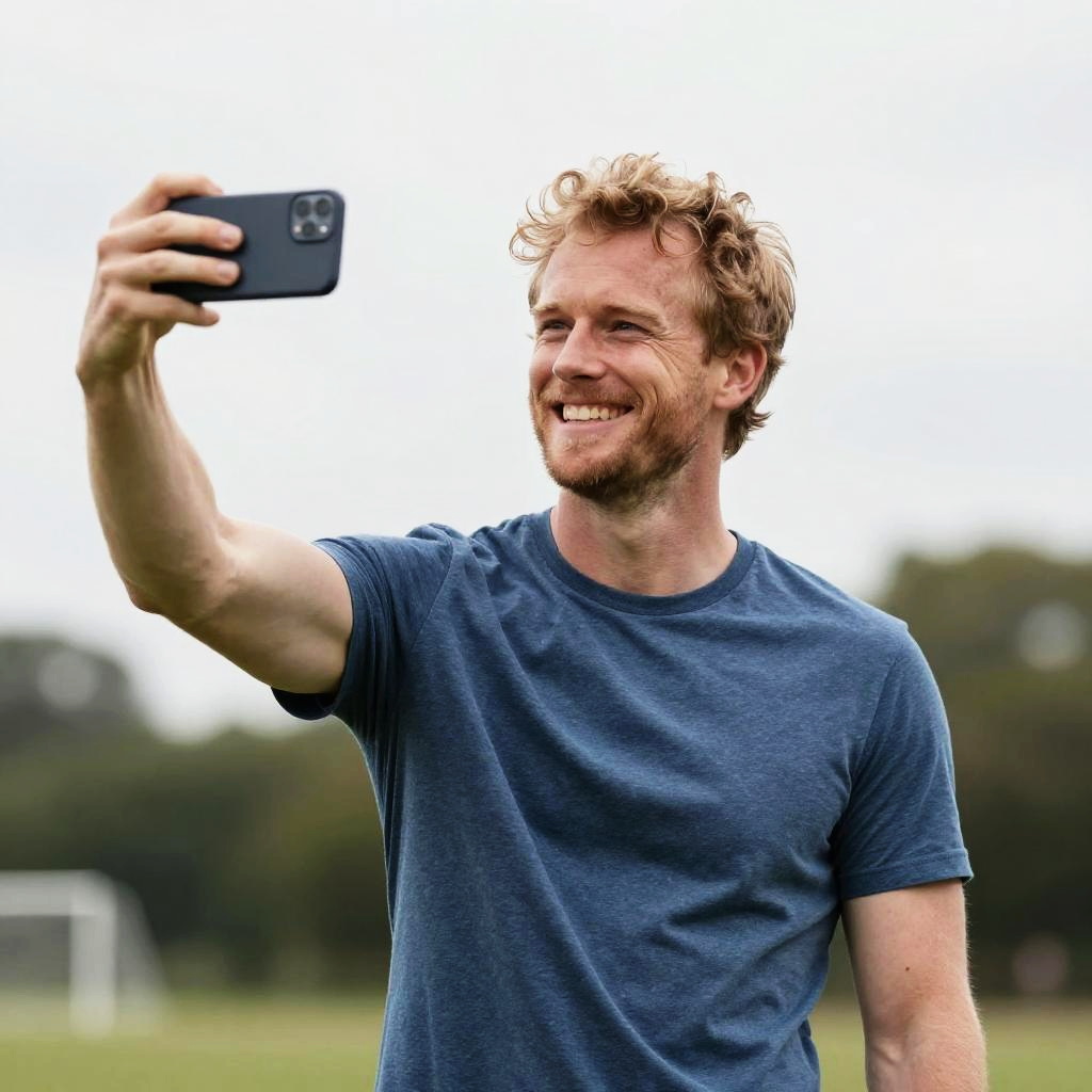 Realistic photo.Mason is standing proudly with a triumphant grin on his face taking a selfie, capturing the moment for posterity. realistic photo