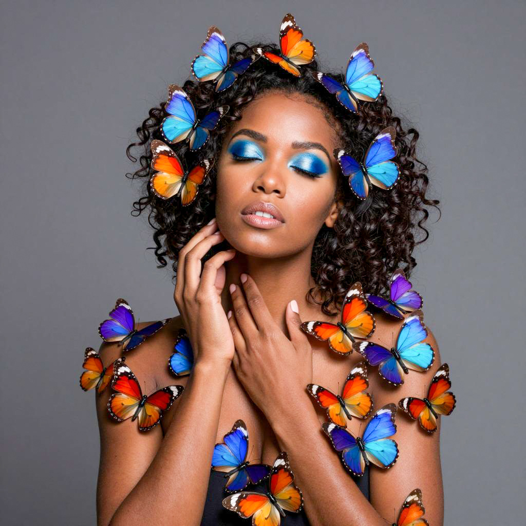 Photograph of a black woman with dark curly hair, closed eyes, and vibrant blue eye makeup. She is surrounded by a dense array of colorful butterflies, including blue, orange, red, and purple, covering her body and head. Her hands are raised to her chest, delicately touching the butterflies. The background is a solid gray color. The woman's expression is serene and relaxed.