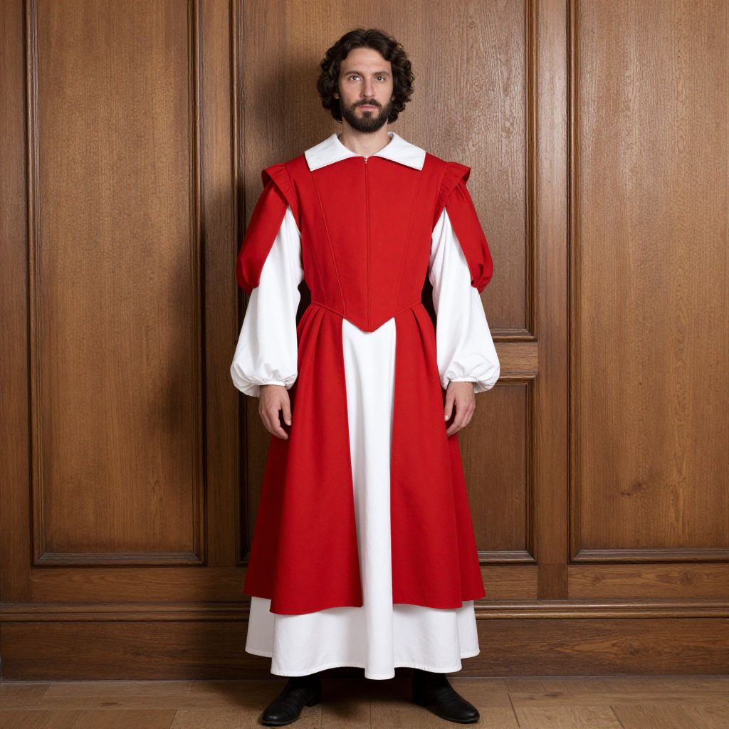 Photograph of a bearded man with curly black hair standing against a wooden paneled wall. He wears a red and white period-style garment with a red bodice, white sleeves, and a white apron over a white undergarment, reminiscent of medieval or Renaissance fashion. The red fabric has a slightly shiny texture, contrasting with the matte white fabric. He stands straight, hands by his sides, wearing black shoes. The wooden background has a rich, brown, textured finish, adding warmth to the image. The man's expression is neutral, and the lighting is even, highlighting the colors and textures of his clothing.