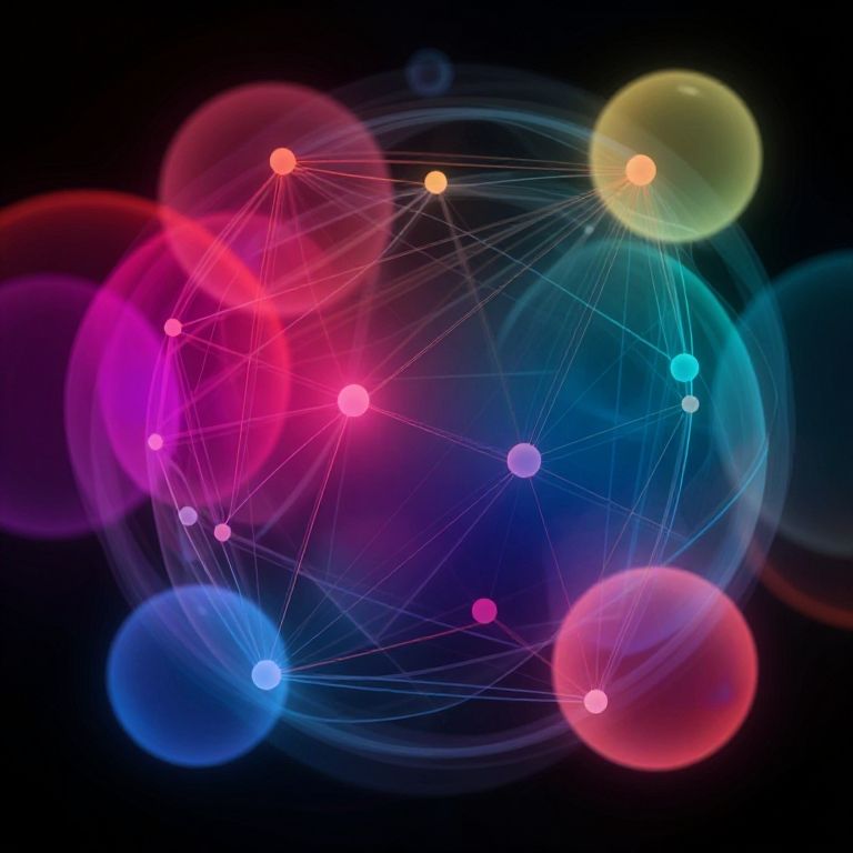 Digital art: Vibrant, multicolored spheres with glowing neon lines connect in a complex network against a dark, starry background.