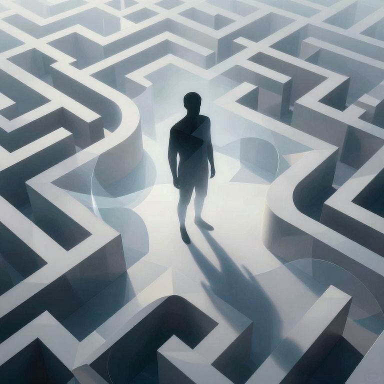 A surreal digital artwork captures an enigmatic figure standing amidst a labyrinthine network of geometric shapes, creating an atmosphere where reality and illusion intertwine. The character's silhouette is shrouded in a complex arrangement of interlocking polygons and abstract curves, their crisp lines softened by the ethereal embrace of translucent surfaces. From an aerial viewpoint, this spectral form looms over the landscape, casting shifting patterns of light and shadow across its surroundings as it stands at the crossroads between tangible shapes and intangible mystery. As the observer navigates through the visual maze, they are drawn into a realm where abstract geometry merges with whispers of intrigue and enigma.