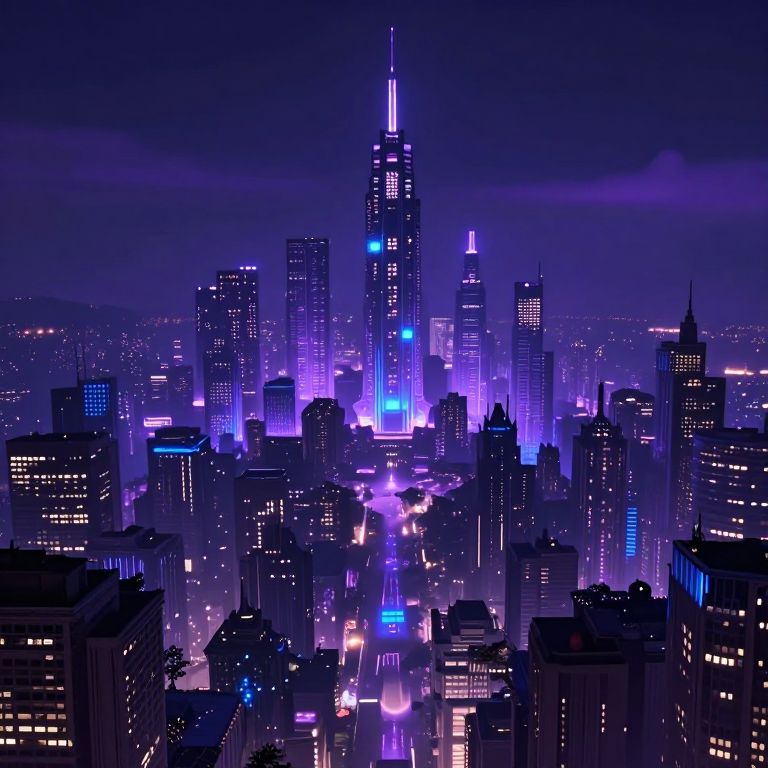 Displacement Mapping magic night time landscape, pandora city at night, avatar movie style , lights are purple and blue, atmosphere is magical fairy tale like,