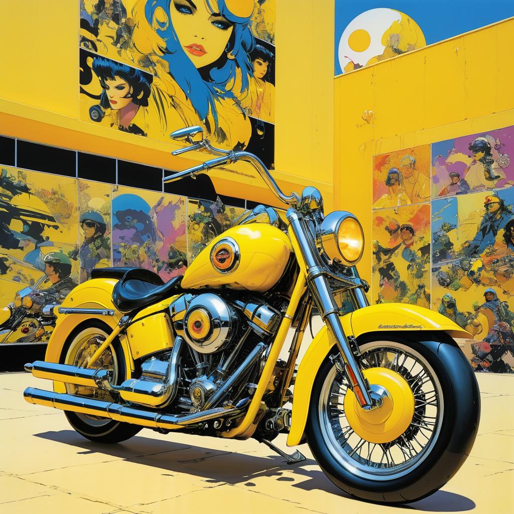 A vibrant yellow Harley-Davidson, no people, styled by Frank Frazetta, Katsuhiro Otomo, with vibrant colors and comic cover art influences.