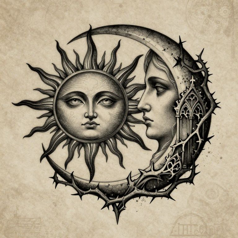 A gothic sun and moon tattoo featuring a radiant sun with piercing eyes and a crescent moon with a somber face, entwined with thorny vines and gothic arches, rich dark shadows and subtle highlights, vintage gothic art style