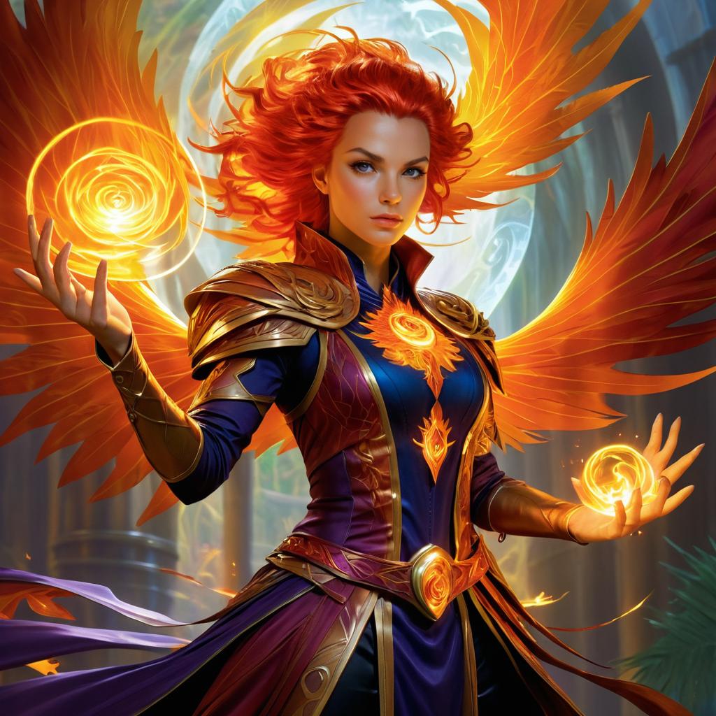 Fantasy character illustration of a phoenix mage in Magic: The Gathering by Julie Dillon, Jesper Ejsing. Styled with cinematic lighting and high detail.