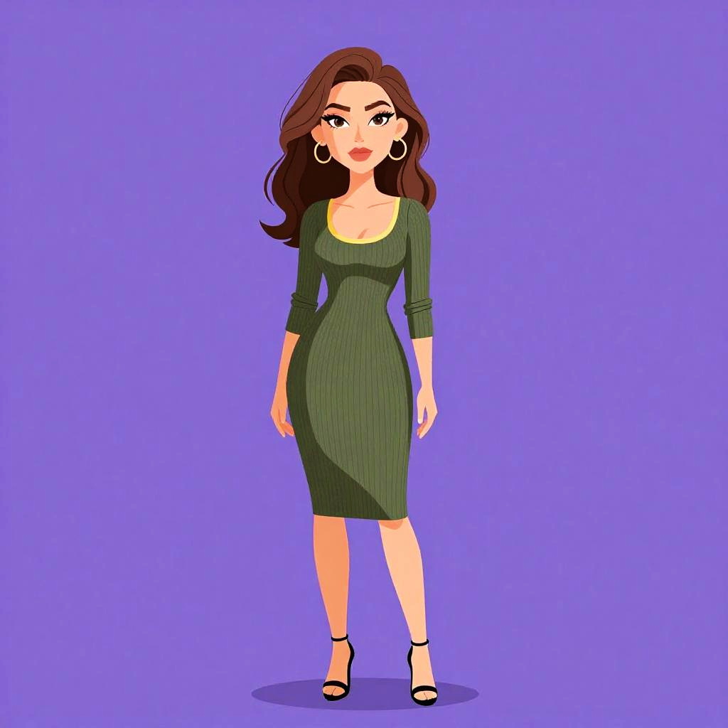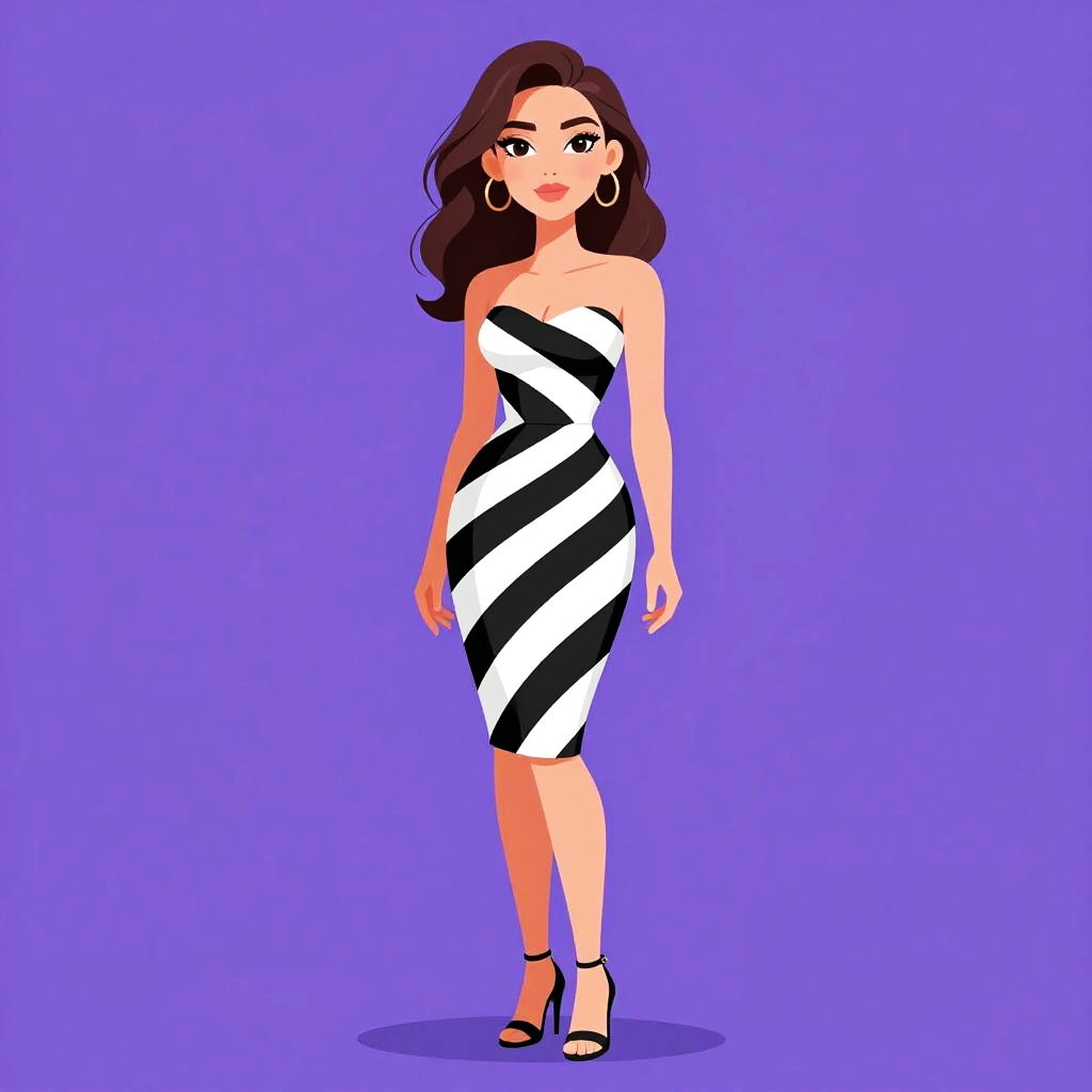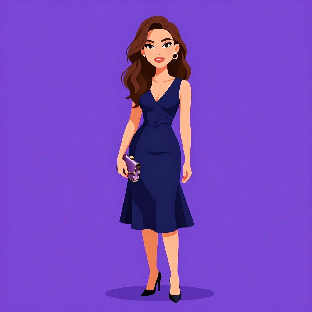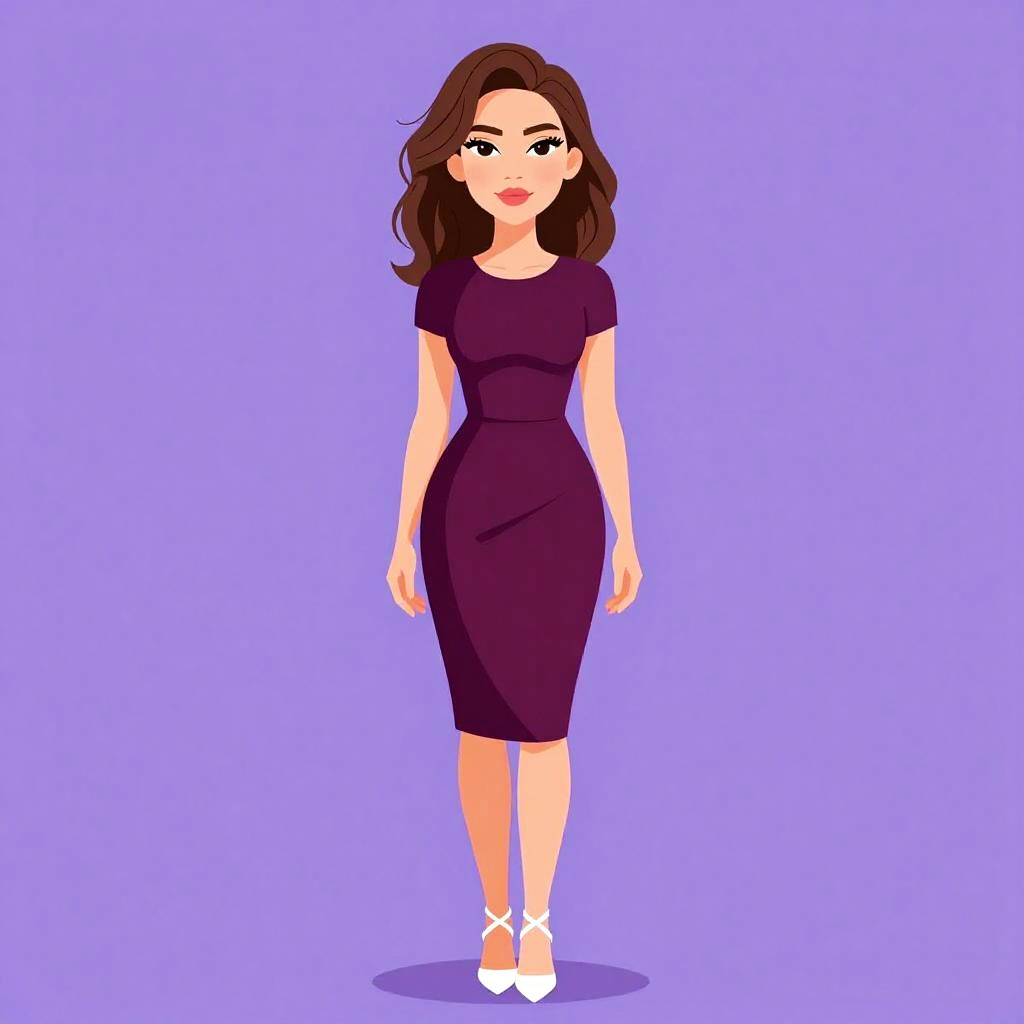 Illustration of a woman with medium skin tone and long wavy brown hair wearing a chic, form-fitting white midi dress with square neckline and cap sleeves. She is also wearing white high-heeled strappy sandals and hoop earrings, standing against a solid purple background.