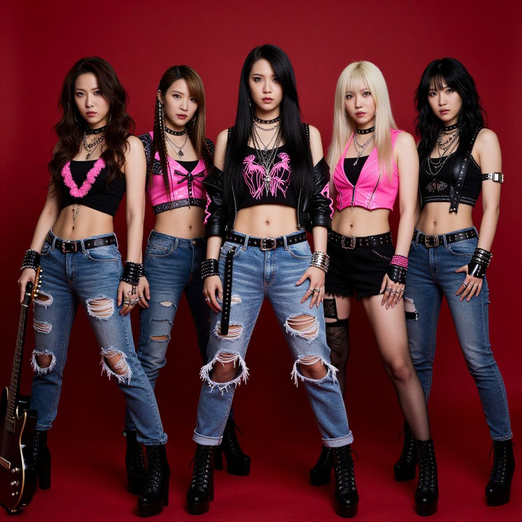 Photograph of five women standing against a solid red background. They're dressed in edgy, punk-rock outfits with ripped jeans, crop tops, and leather accessories. The woman on the left has dark brown hair and holds a guitar. The others have varying hair colors from blonde to black, and wear bold colors like pink and black. They all have confident, tough looks.