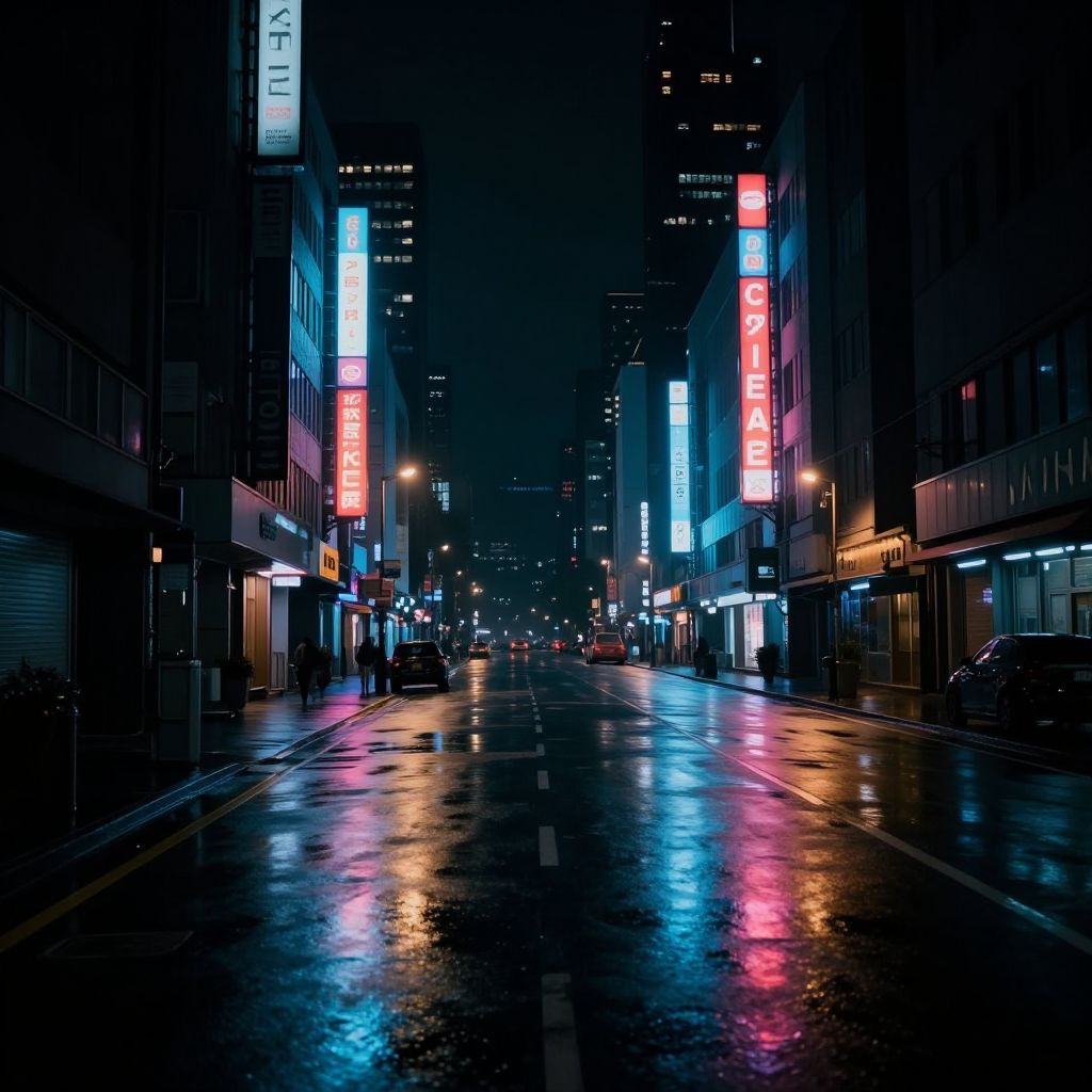 City late night aesthetic, neon lights reflecting on wet streets, quiet urban landscape with glowing signs, moody atmosphere, deep shadows and vibrant colors, futuristic metropolis vibe, cinematic wide angle shot
