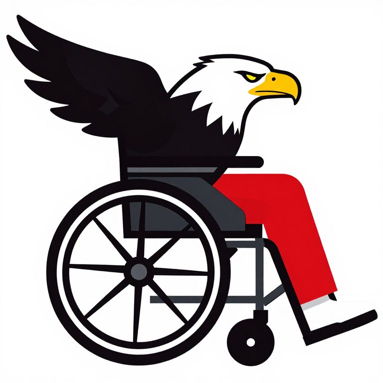 The image features a vibrant, stylized logo that combines elements of a person in a wheelchair and an eagle. The person, depicted in a dynamic pose, is seated in a wheelchair with their legs extended and feet firmly planted on the ground. The wheelchair is detailed with visible spokes and a sturdy frame, suggesting a sense of stability and mobility. The person is wearing red pants and white shoes, adding a pop of color to the composition.