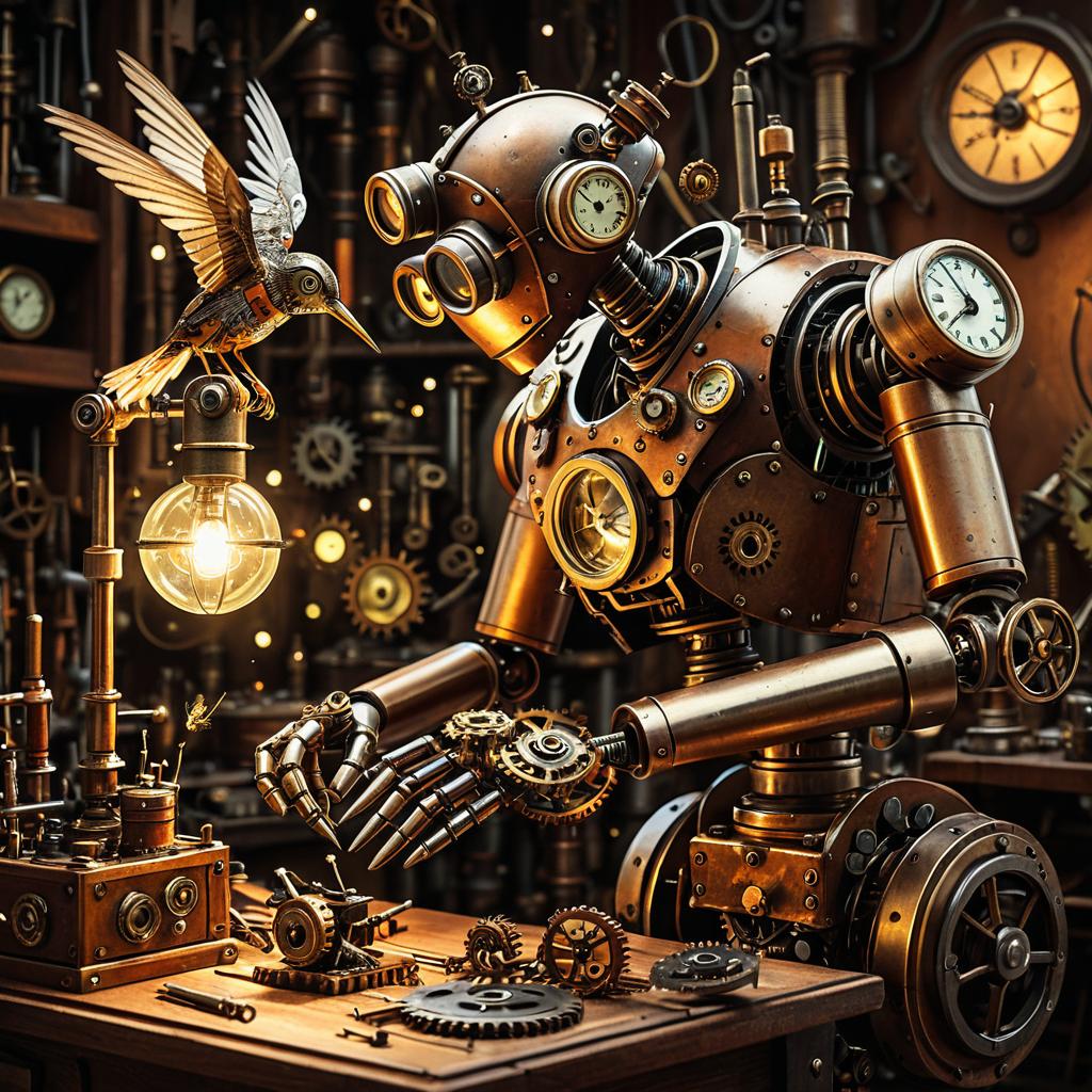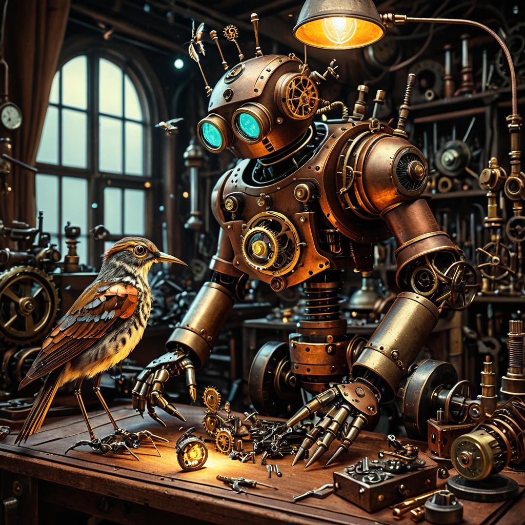 A curious steampunk robot examining a tiny mechanical bird in an old invention workshop filled with vintage tools and cogs, rendered in intricate digital art with brass and copper tones with glowing fireflies and a gentle warm color palette.