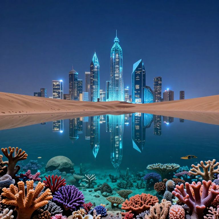 Photorealistic digital art: Vibrant coral reef in the foreground, reflecting a glowing blue skyscraper city skyline at night, over a calm, reflective