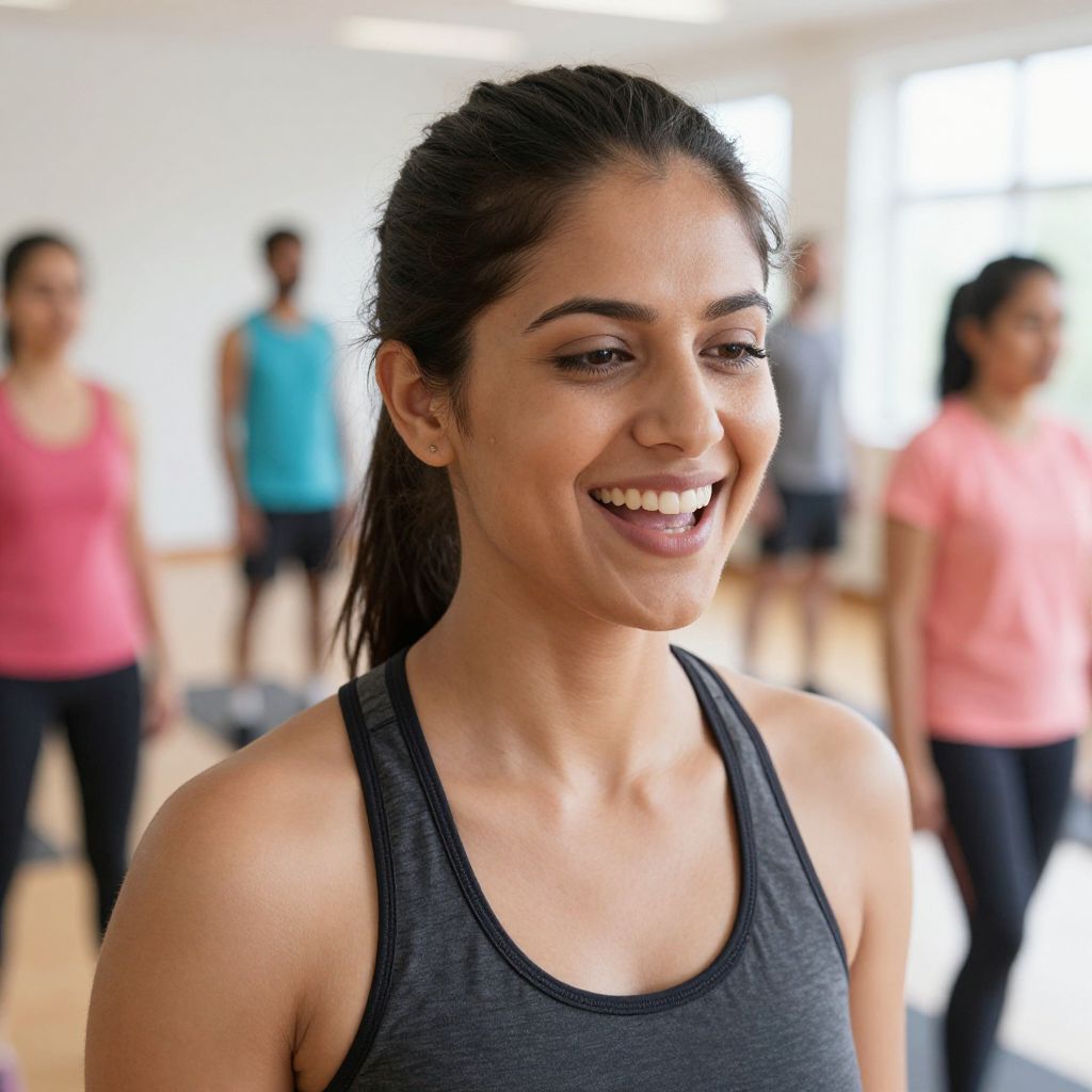 Closeup of an happy Indian woman in an excercise class - respiration, physical, diverse, relax, variation, recreation,...