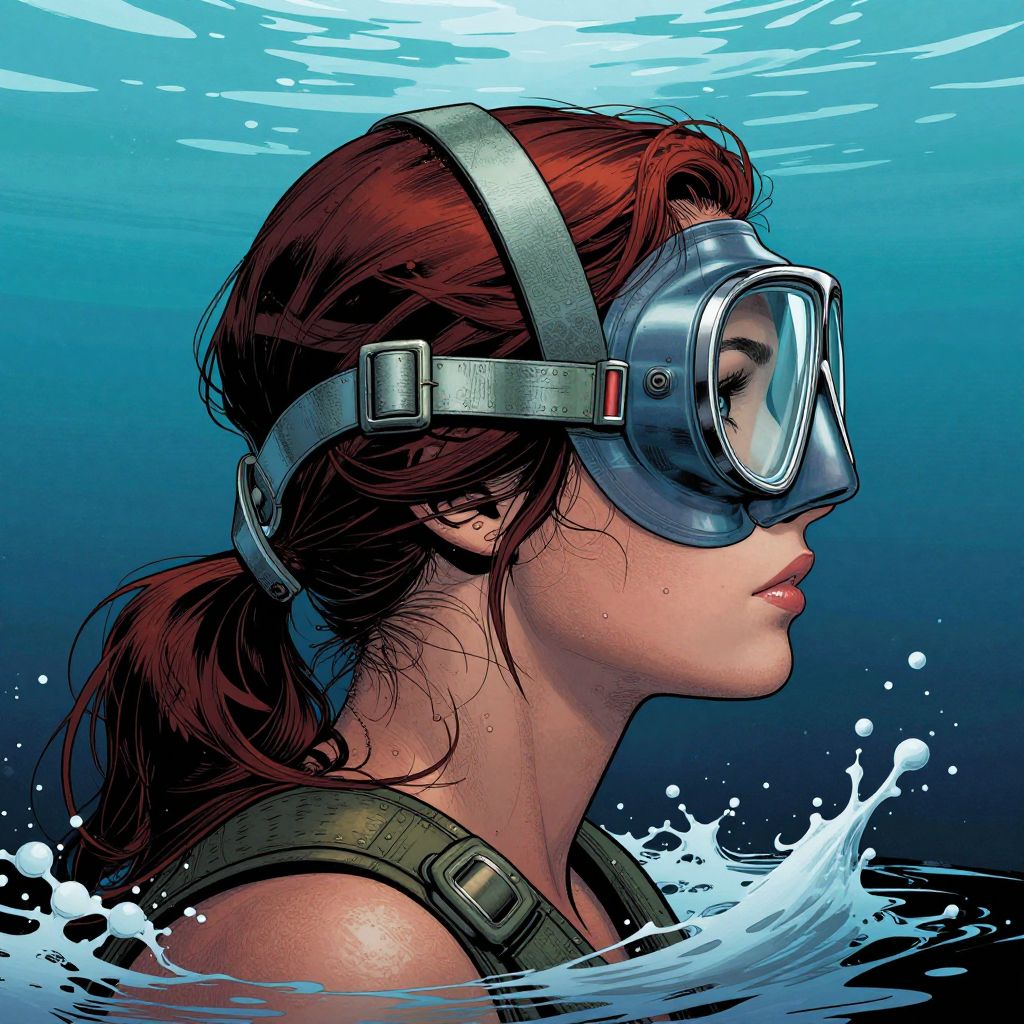 Digital artwork of a red-haired woman with scuba gear, gazing underwater, surrounded by splashing water and blue gradients.
