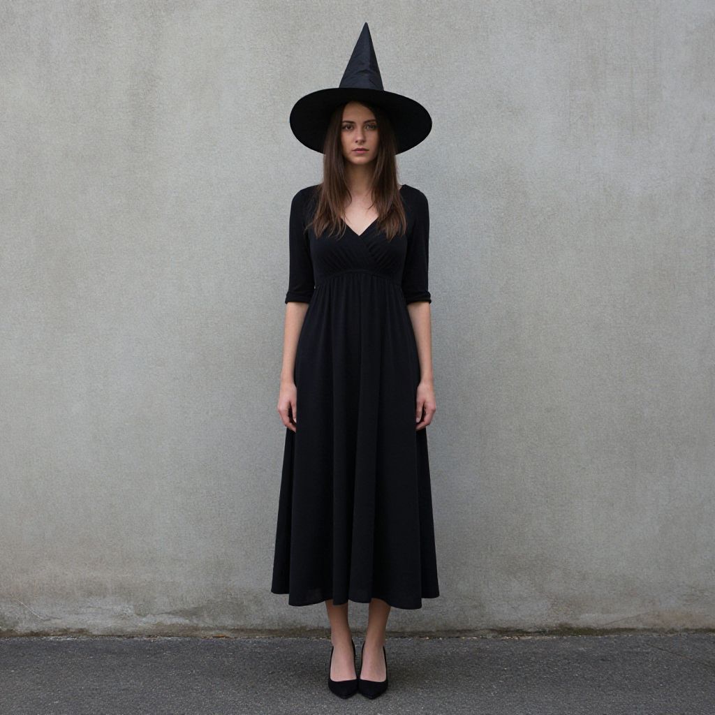 Photograph of a young woman standing against a plain, light gray concrete wall. She has long, straight brown hair and a pale complexion. She is wearing a large, black, pointed witch hat and a black, knee-length dress with three-quarter length sleeves. Her dress has a V-neck and a slightly loose, flowing fit. She is also wearing black high-heeled shoes. The ground she stands on is dark gray asphalt. Her expression is neutral, and she stands with her arms relaxed at her sides. The overall style is simple and classic, with a slight gothic or witch-like theme.