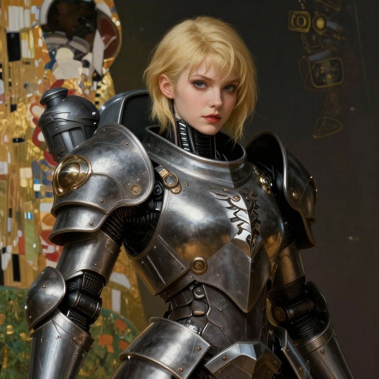 This is a highly detailed digital illustration of a blonde, blue-eyed woman with fair skin, wearing shiny, silver medieval-style armor. Her armor has intricate designs and is highly polished, reflecting light. She has short, tousled hair and a determined expression. The background features a blurred, colorful, mosaic-like pattern with gold accents and a dark, textured wall. The image has a realistic, yet slightly stylized, fantasy art style, emphasizing the character's strength and readiness. The lighting highlights the metallic texture of her armor, creating a dramatic contrast with her soft facial features.