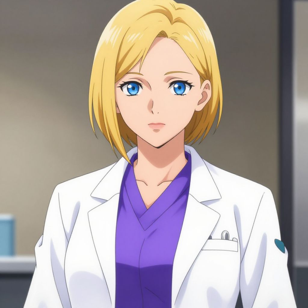 This digital anime-style illustration depicts a young woman with straight, shoulder-length blonde hair and striking blue eyes. She wears a white lab coat over a purple scrub top, suggesting a medical profession. Her expression is neutral, and she stands against a softly blurred background that includes indistinct gray and blue tones. The lighting is even, highlighting her fair skin and the crispness of her white coat. A small white pocket is visible on the left side of her coat. The overall aesthetic is clean and professional, emphasizing her role as a medical professional.