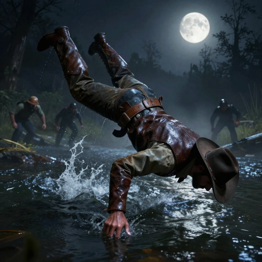 RDR2 dive action, nighttime plunge into a moonlit river by a cowboy escaping pursuers, mist rising from water, dark forest backdrop, detailed leather attire glistening with water droplets, mood lighting creating dramatic shadows and atmospheric tension