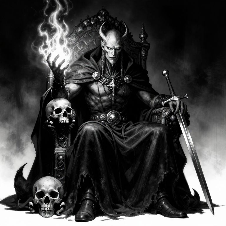 Trim A powerful lich sitting in its throne of skulls, conjuring an unholy flame with one hand and leaning on a sword with another. Style is black & white, black metal art.,