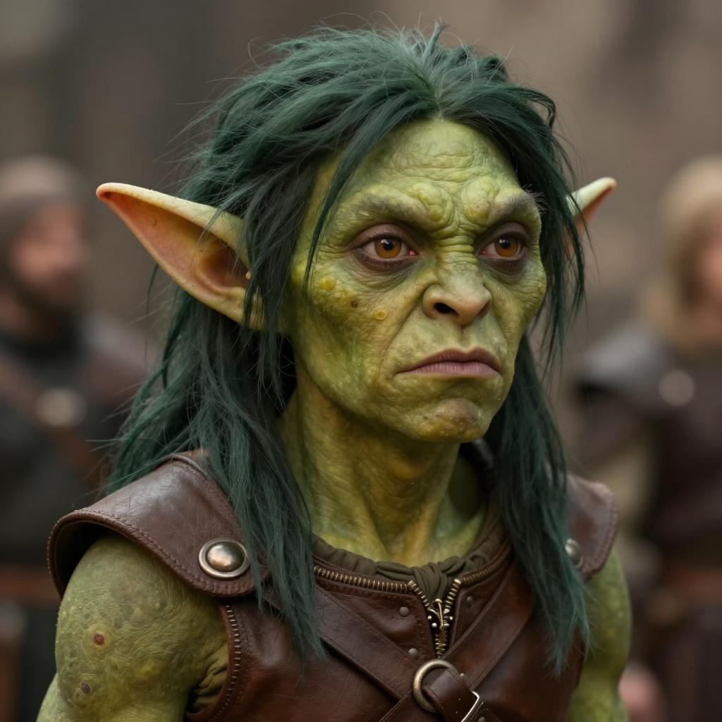 Goblin cosplay, photo-realistic CGI of a goblin, front view, green skin, pointed ears, serious expression, messy dark green hair, wearing brown leather harness over olive green shirt, medieval fantasy setting, blurred background with indistinct people, warm lighting, detailed ures on skin and clothing, realistic shading, slightly dramatic lighting on face, middle of frame, upper body, casual fantasy genre, realistic style, detailed ures and light, slightly warm color palette