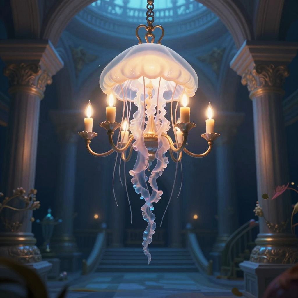 An imaginative hybrid of a jellyfish and a chandelier, featuring tentacles glowing with soft candlelight, set against an underwater palace.