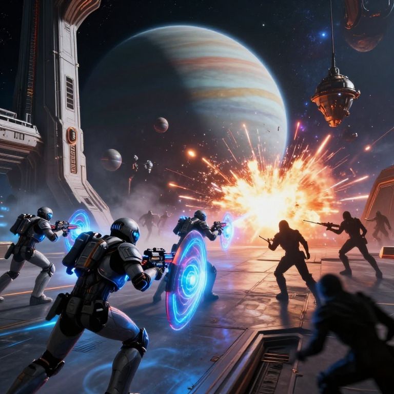 Dynamic battle scene between Acturian defenders with energy shields and advanced weaponry versus shadowy invaders, set within a futuristic fortress floating in space over a gas giant planet, with explosive effects and vibrant cosmic colors enhancing the intensity.
