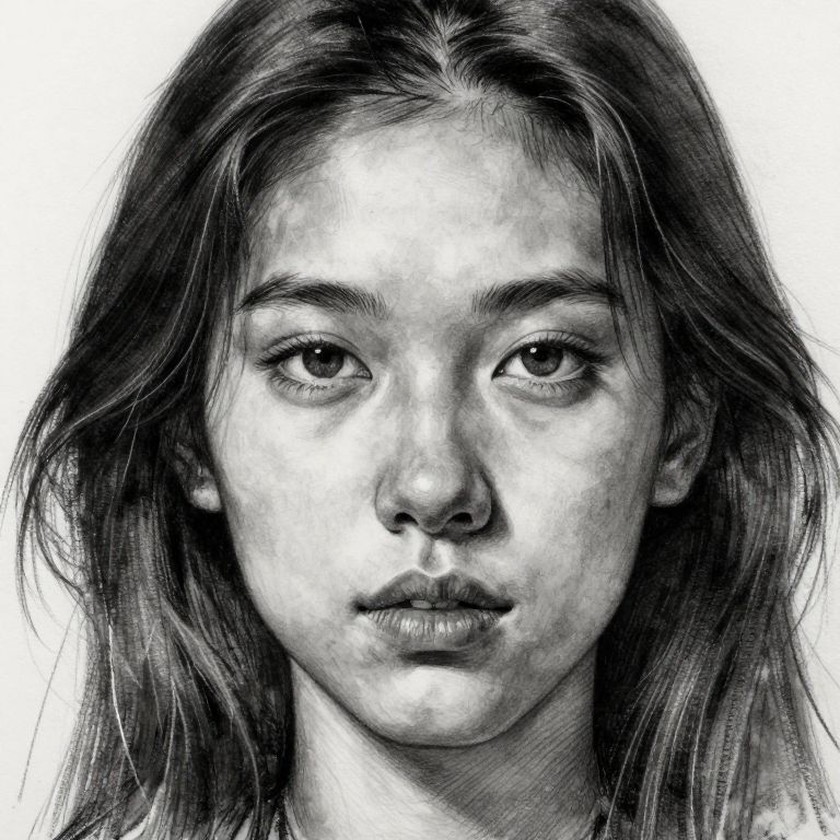 Monochromatic pencil drawing of a young woman with long, slightly messy hair, large eyes, and neutral expression, detailed shading, white background.