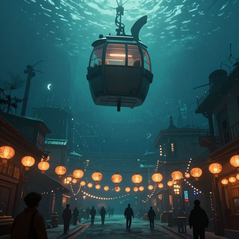 In a dreamlike underwater cityscape, a suspended gondola defies gravity as it hangs upside-down above a bustling street lined with glowing lanterns, while silhouetted figures navigate the surreal, inverted world below.