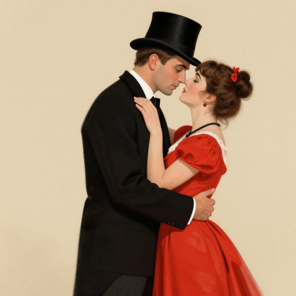 A romantic illustration in a vintage retro style, featuring a couple in elegant attire—a man in a black suit and top hat and a woman in a red dress—embracing tenderly against a soft beige background, evoking the classic charm reminiscent of Vettriano's artwork.