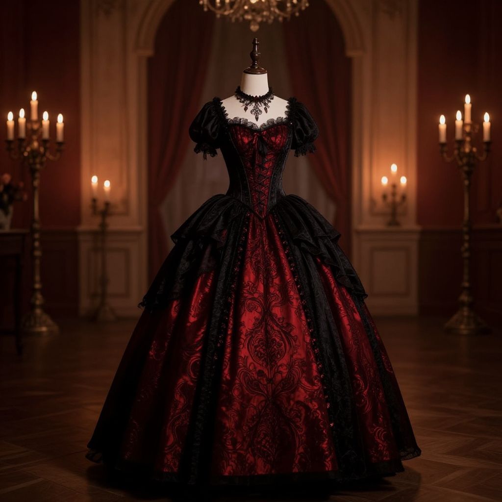 Goth uniform, elegant gothic ball gown with corset details, deep red and black hues, intricate patterns, candlelit ballroom, dramatic shadows, romantic yet eerie mood