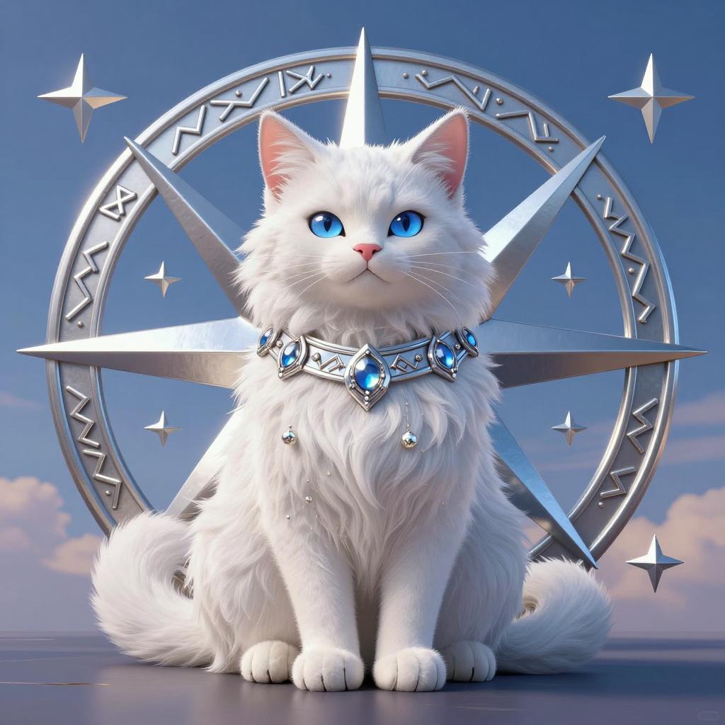 Professional icon, star background, world of warcraft style, ultra detailed, ultra realistic glossy silver, jeweled collar, white long fur cat, sitting, full body, fantasy, soft lighting, colorful, blue sky with clouds, metal rune circle in background frame the image,