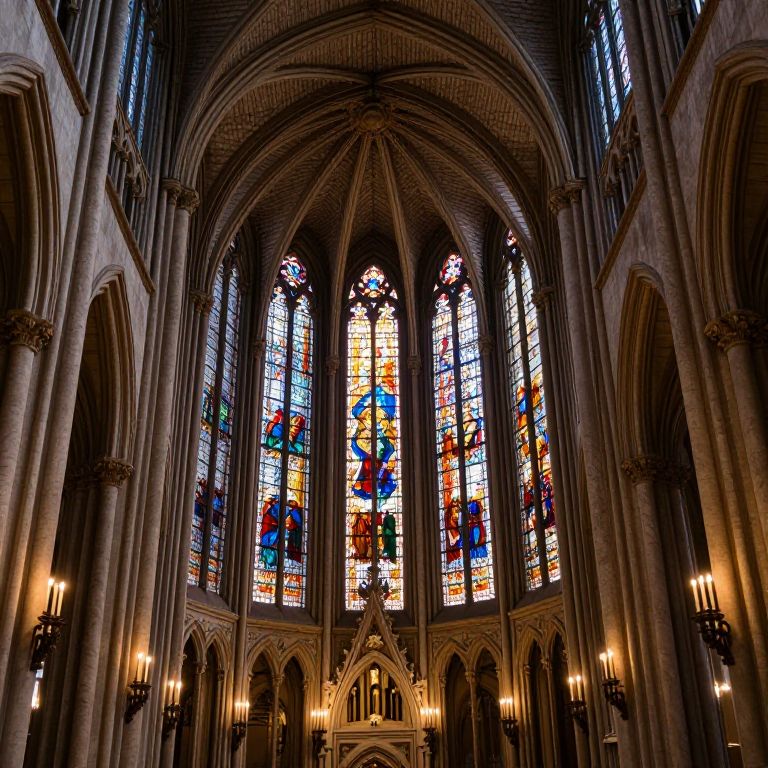 Photograph of a grand Gothic cathedral interior, showcasing vibrant, multi-colored stained glass windows and tall, arched stone columns. Warm, ambient lighting illumin